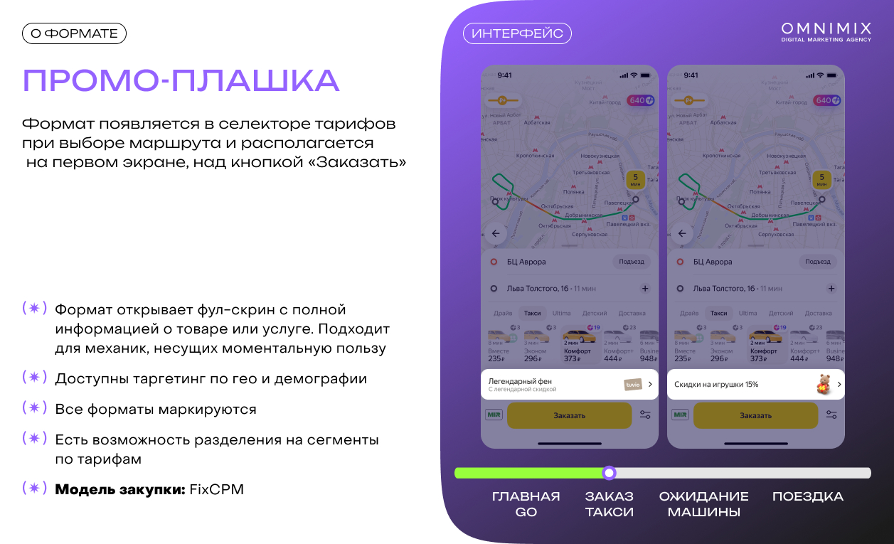 Сквозной формат, который работает на всех этапах воронки такси: от заказа до завершения поездки. Удачно подсветит товарные предложения бренда.
