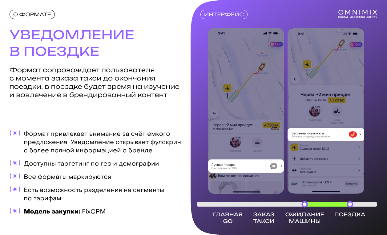 Формат сопровождает пользователя с момента заказа такси до окончания поездки: в поездке будет время на изучение и вовлечение в брендированный контент.