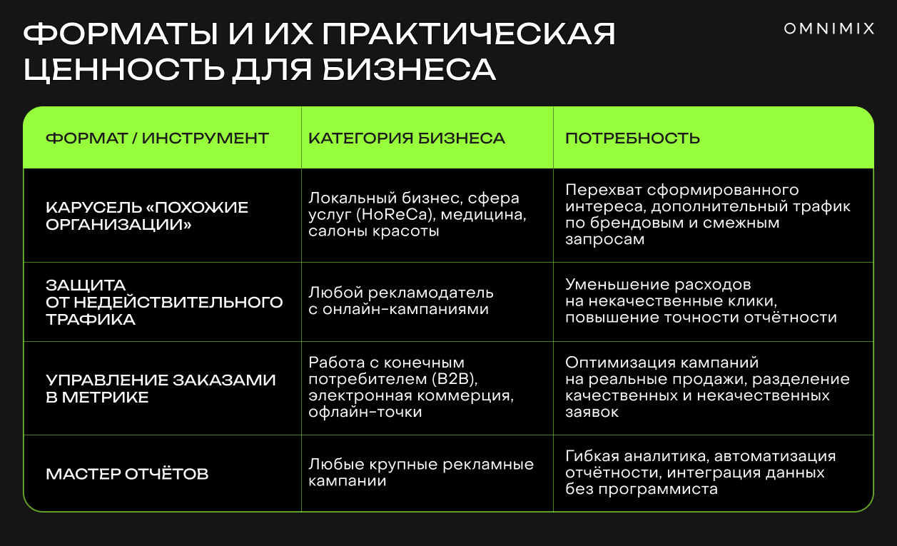 Формат открывает дополнительный источник трафика: пользователь уже находится в поиске услуги, а задача рекламодателя — попасть в список рассматриваемых вариантов.