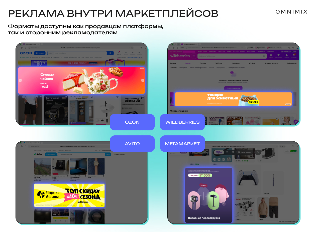 Маркетплейсы — Ozon, Wildberries, Мегамаркет, Авито и другие — представляют собой среду, в которой пользователь уже находится в состоянии сформированного или почти сформированного спроса. В отличие от медийных каналов, здесь бренд работает с уже сформированным интересом, и цель кампании — стимулировать пользователя к действию. Реклама здесь работает как механизм перераспределения выбора внутри уже существующего намерения.