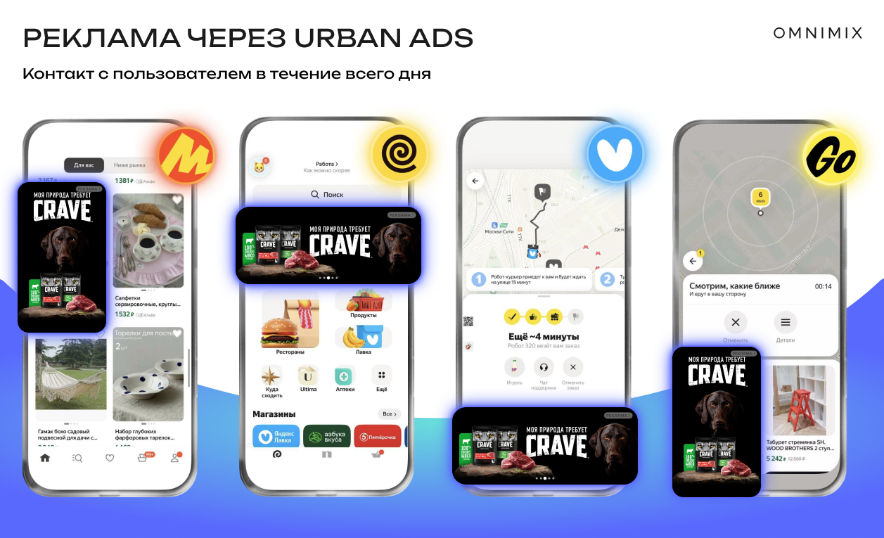 Речь идет о присутствии бренда в момент регулярных действий: перемещения по городу, заказа еды, повседневных покупок, навигации. В результате реклама встраивается в саму структуру жизни пользователя.