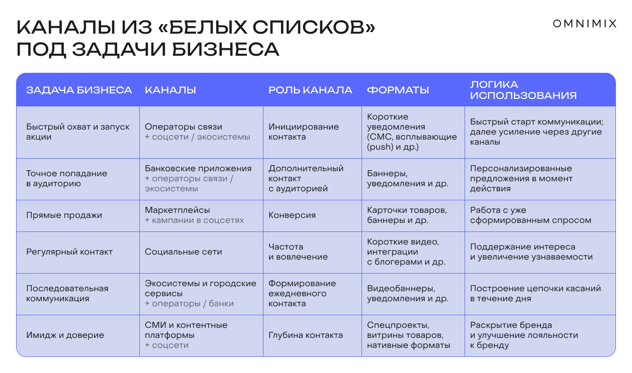 Ниже — обобщенная схема, которая помогает соотнести задачи бизнеса с доступными каналами внутри «белых списков» и выстроить из них работающую стратегию.