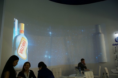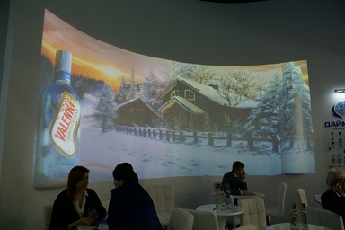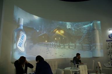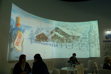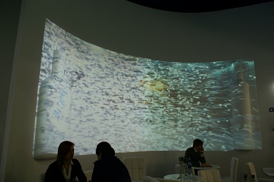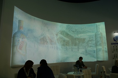 Стенд с прекрасным брендированным роликом 3D mapping, один и з самых "хайтековых" стендов. Кроме видео контента, блы прекрасный саунд. По бокам экрана, были объемные бутылки, на которые был "завязан" общий ролик. К сожалению видео нет, просто фото расскадровка. Хотя конечно фото не передает всего того эффетка завязанного на видео+саунд.