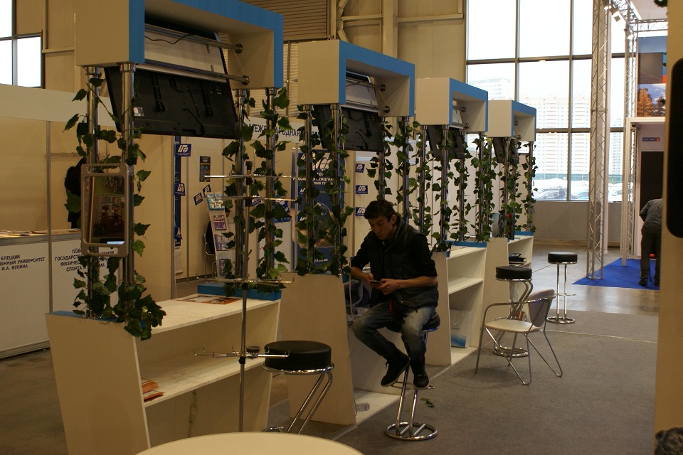 А эта стойка "регистрации" как в аэропорту. Даже если это и имитация аэропорта, зачем тут пластиковая зелень??? в таком количестве? А вот вид этих стоек сзади. Если "ЭТО" видно со всех сторон и с проходов, то это такая же важная визуальная часть стенда, и все эти "кишки" от панелей нужно было закрывать. И, конечно, резиновые стебли с листами.