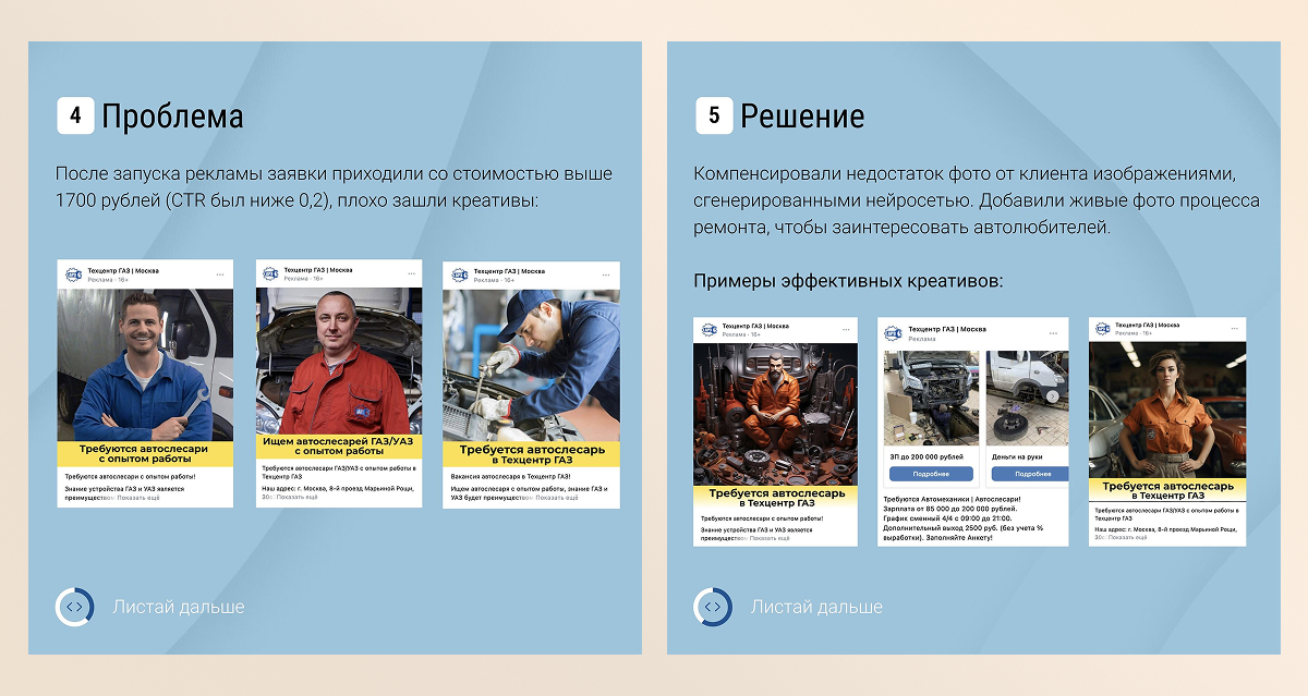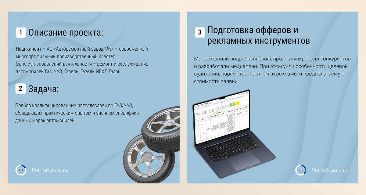 Детальное изучение брифа клиента, анализ рынка труда автослесарей по ГАЗ/УАЗ, исследование предложений конкурентов по зарплатам и условиям работы. Разработка медиаплана, включающего определение целевой аудитории, настройку таргетированной рекламы и расчет прогнозируемой стоимости получения одной заявки.