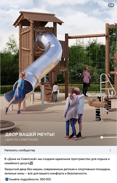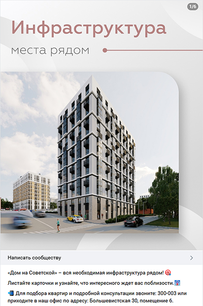 Разработали контент-план, рассказывающий о преимуществах «Дома на Советской». Каждый пост оформлен в едином стиле и содержит призыв к действию.