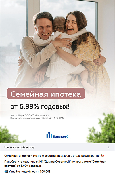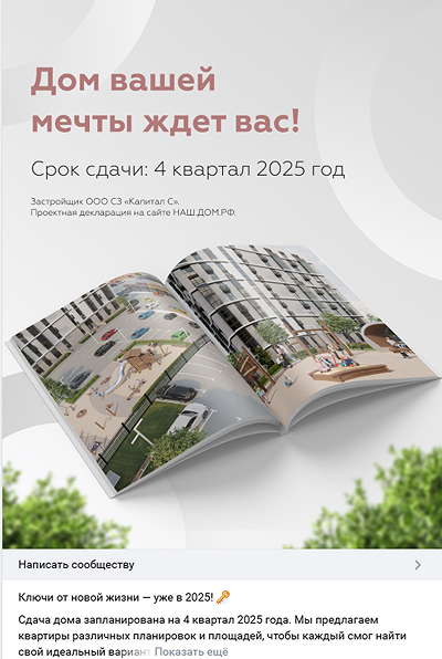 В рекламных креативах и текстах акцентировались следующие преимущества застройщика «Капитал С»: