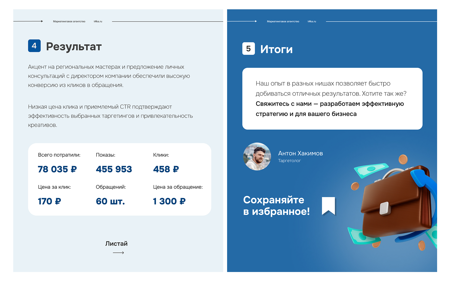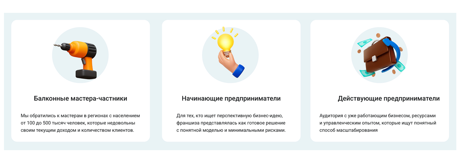 Тестовая рекламная кампания по продаже франшизы остекления балконов показала отличные результаты благодаря персонализированному подходу и фокусу на трёх ключевых сегментах аудитории. Акцент на региональных мастерах и предложение личных консультаций с директором компании обеспечили высокую конверсию из кликов в обращения. Низкая цена клика и приемлемый CTR подтверждают эффективность выбранных таргетингов и привлекательность креативов.