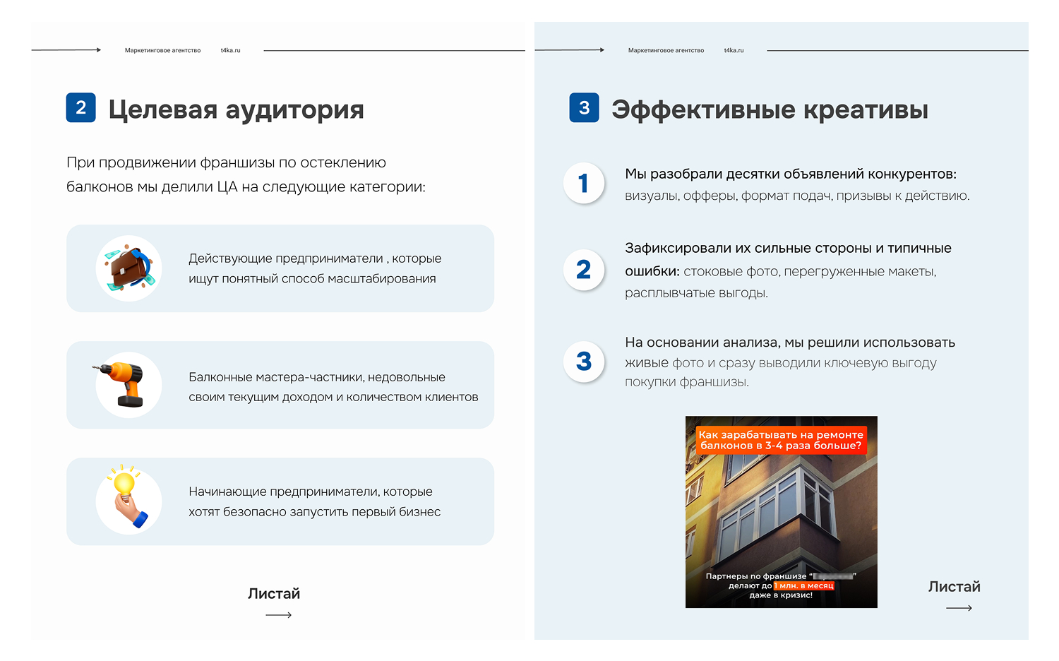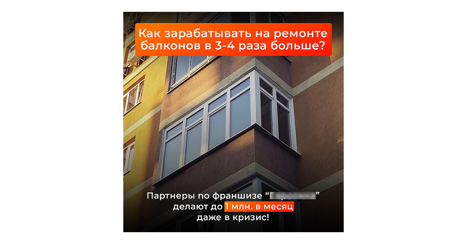 Креативы для рекламы франшизы по остеклению балконов должен привлекать предпринимателей, а не конечных клиентов. Показывать нужно не просто красивые балконы, а бизнес-потенциал: успешные франчайзи, поддержку компании, готовые проекты, команду.