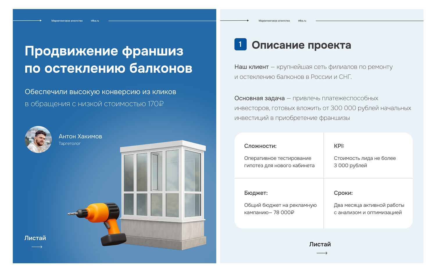 «Привет! Меня зовут Антон, я таргетолог. В нашем агентстве мы постоянно работаем с проектами по продвижению франшиз. Для этого клиента, продвигающего франшизу по остеклению балконов, через ВКонтакте обеспечили высокую конверсию из кликов в обращения с низкой стоимостью 170р»