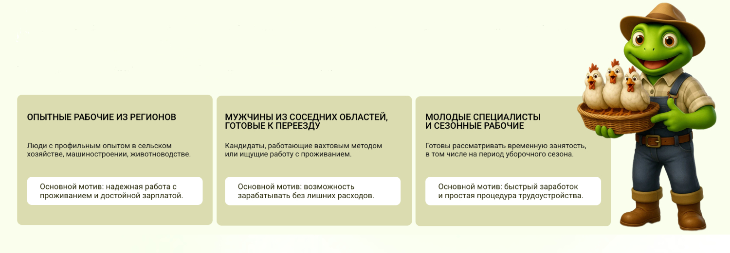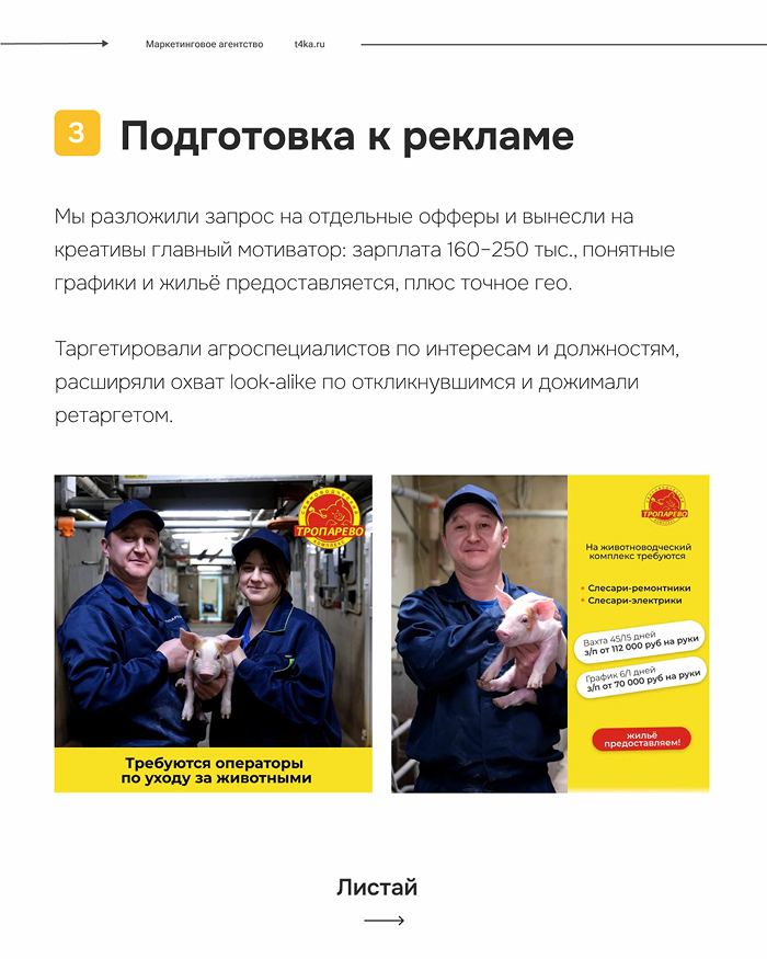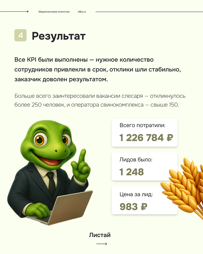 Для набора комбайнеров и трактористов запустили ретаргет на тех, кто уже приезжал на сезонные работы — это дало много целевых и недорогих откликов. Ну и важный момент — все заявки обрабатывались быстро, что значительно повысило шансы на успешное трудоустройство.