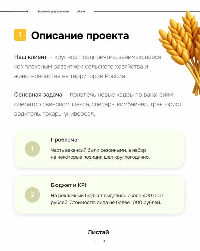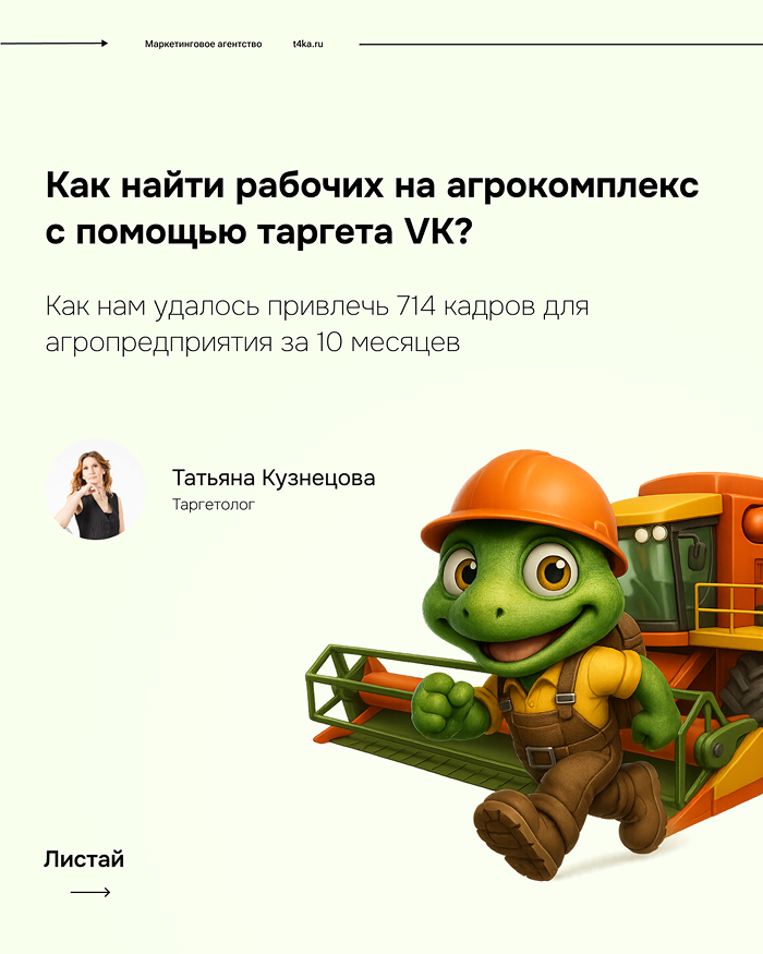Привет! Мы — агентство таргетированной рекламы «В точку». В этом кейсе мы расскажем, как мы привели 714 кадров для агропредприятия благодаря таргетированной рекламе ВКонтакте за 10 месяцев.