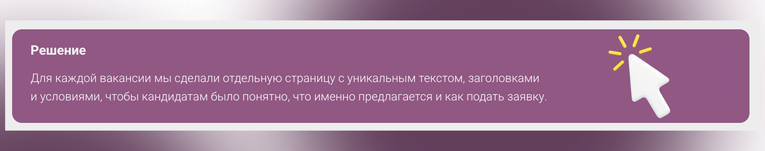Для каждой вакансии мы сделали отдельную страницу с уникальным текстом, заголовками и условиями, чтобы кандидатам было понятно, что именно предлагается и как подать заявку.