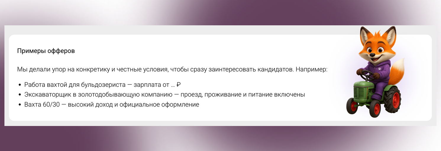 Мы делали упор на конкретику и честные условия, чтобы сразу заинтересовать кандидатов. Например: