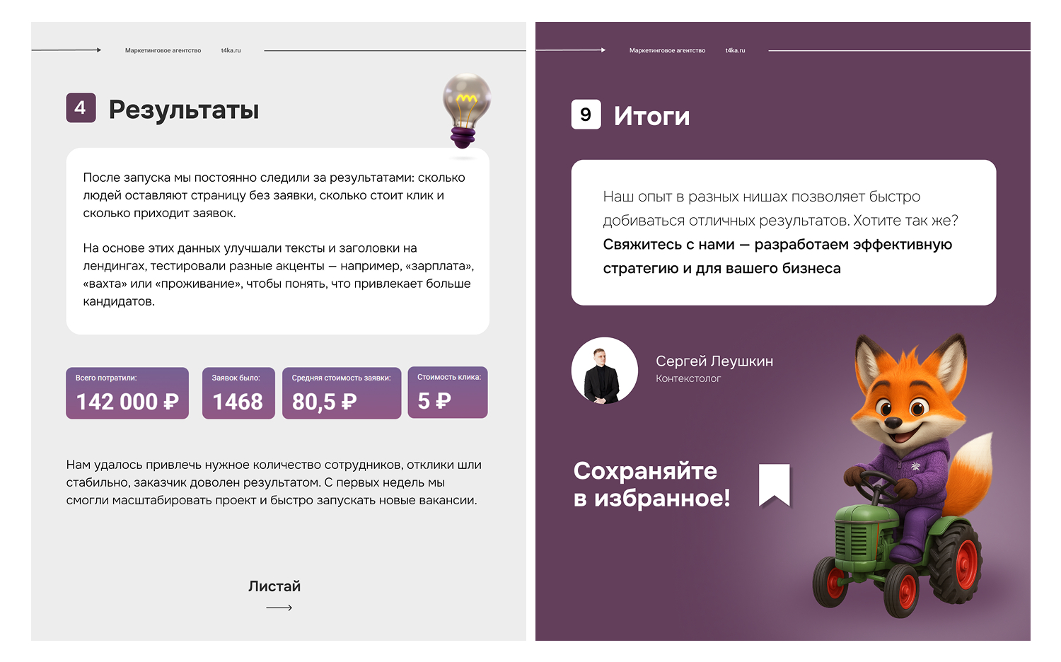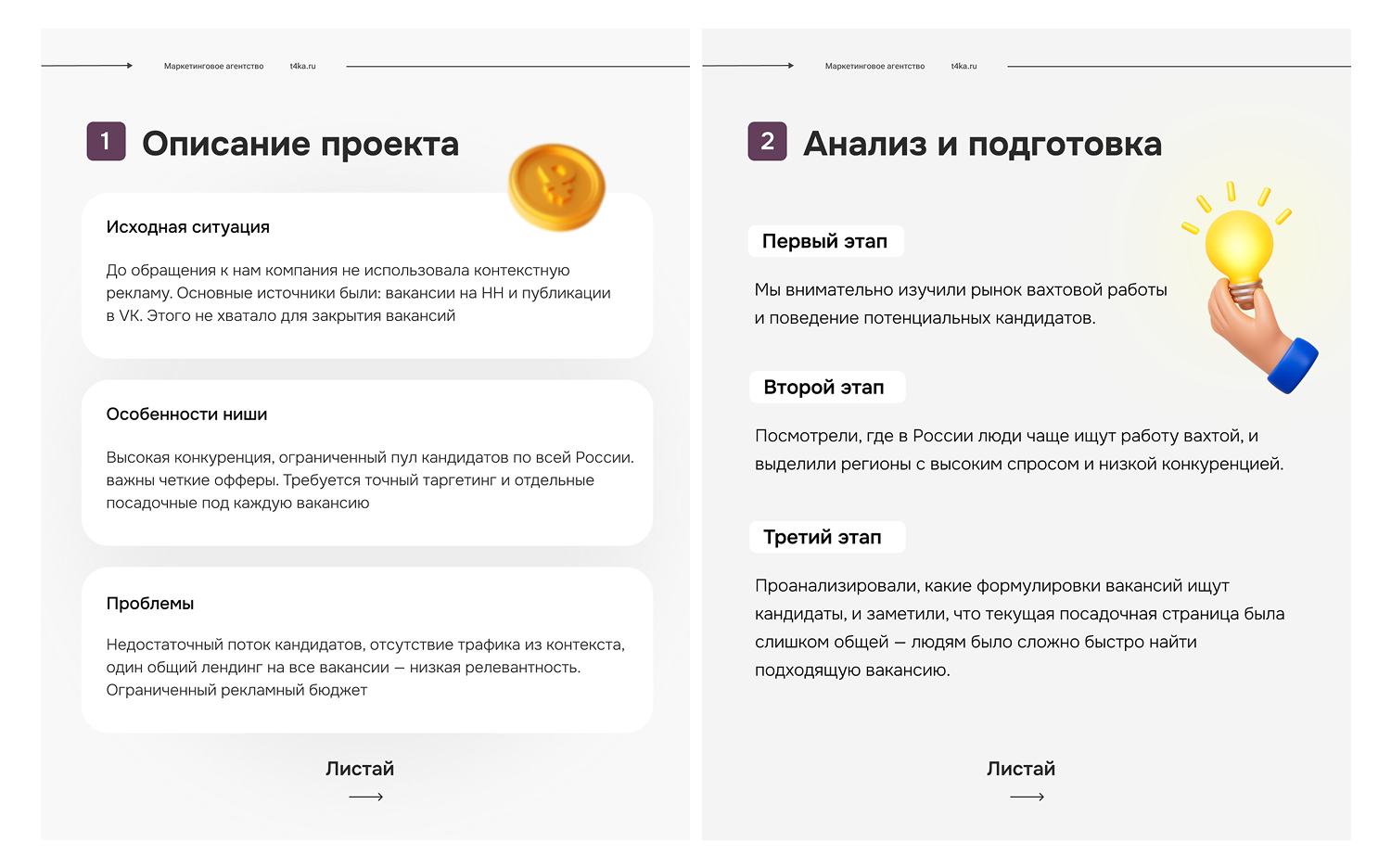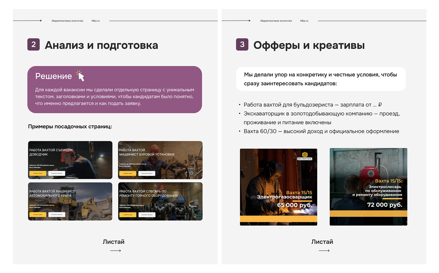 После запуска мы постоянно следили за результатами: сколько людей оставляют страницу без заявки, сколько стоит клик и сколько приходит заявок. На основе этих данных улучшали тексты и заголовки на лендингах, тестировали разные акценты — например, «зарплата», «вахта» или «проживание», чтобы понять, что привлекает больше кандидатов.