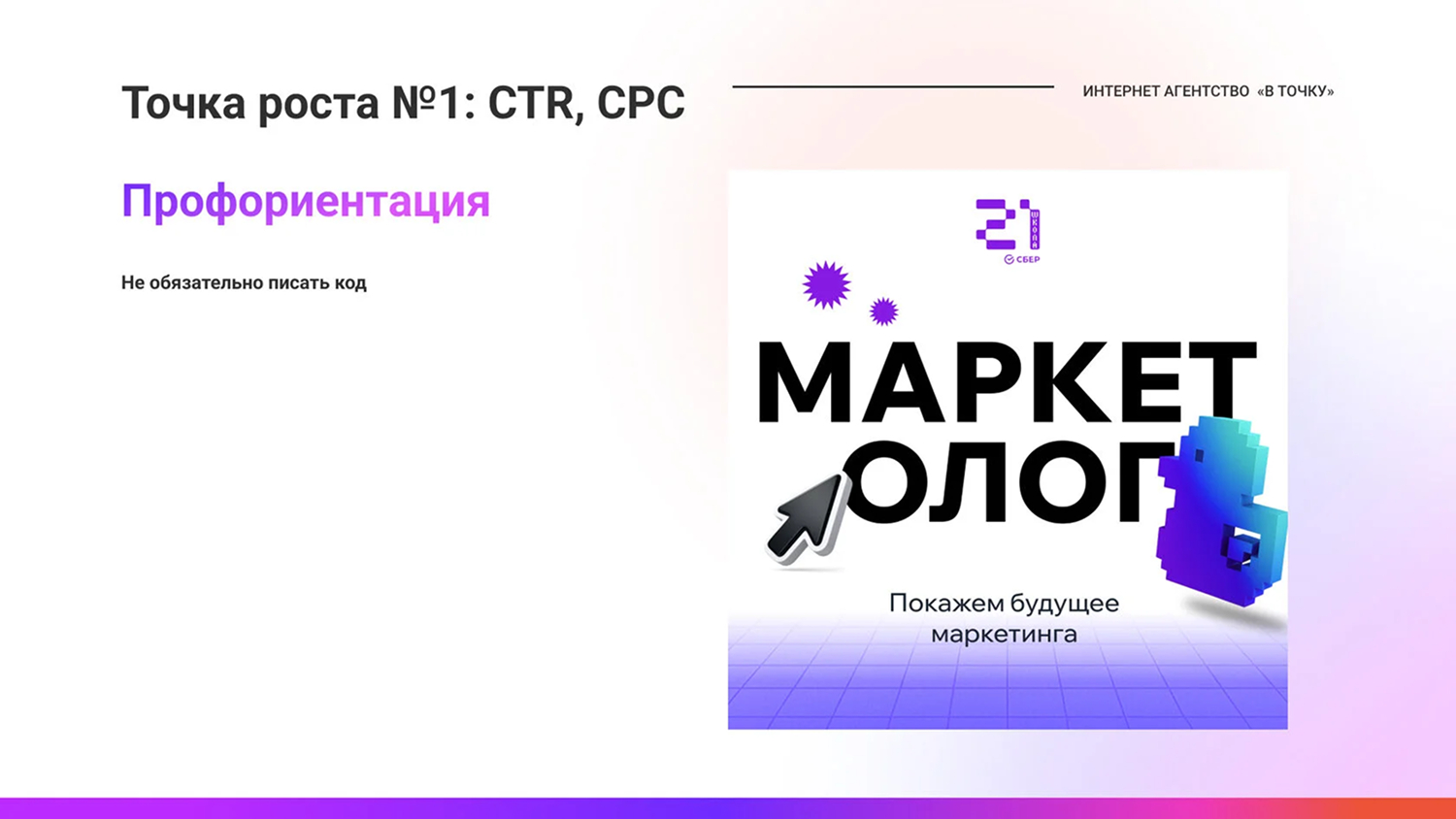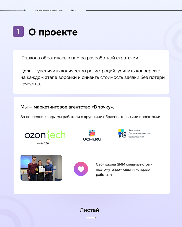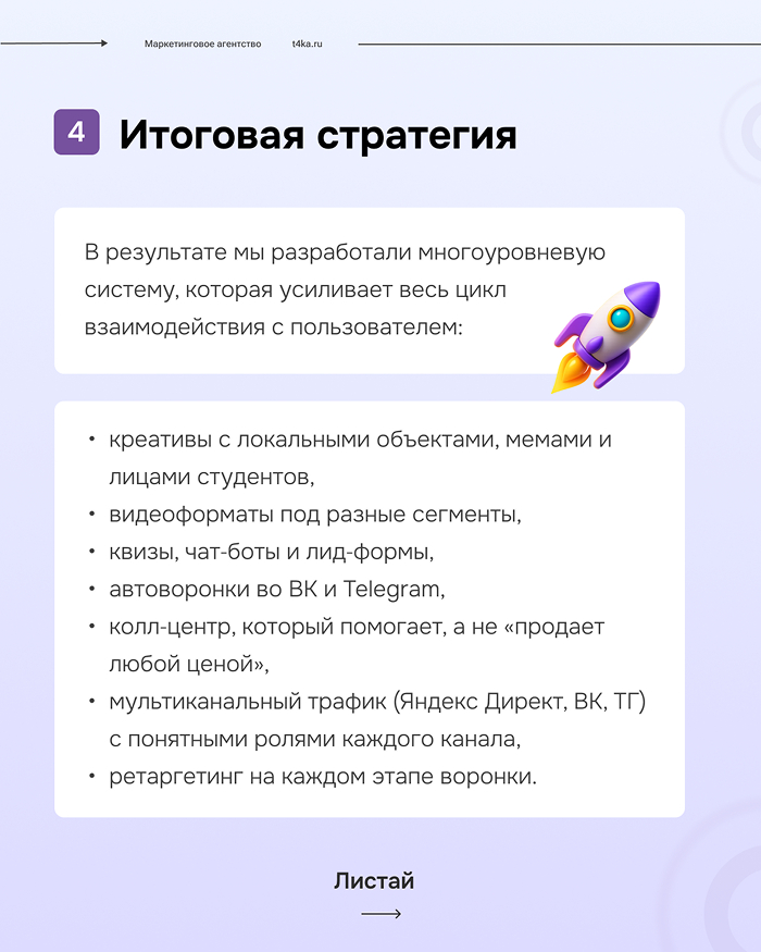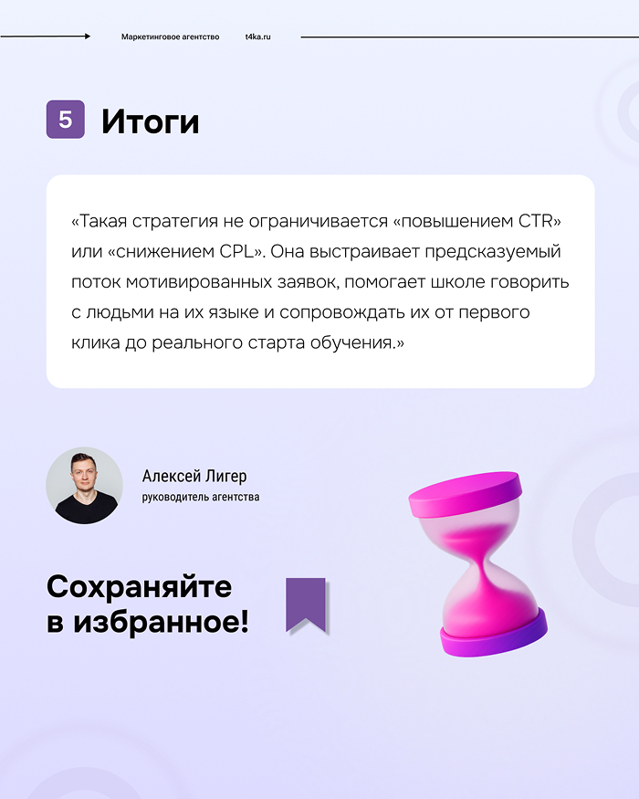 «Такая стратегия не ограничивается «повышением CTR» или «снижением CPL». Она выстраивает предсказуемый поток мотивированных заявок, помогает школе говорить с людьми на их языке и сопровождать их от первого клика до реального старта обучения. И именно поэтому мы считаем: это не просто рекламная кампания, а система роста, которую можно масштабировать и на другие IT‑ и образовательные проекты.»