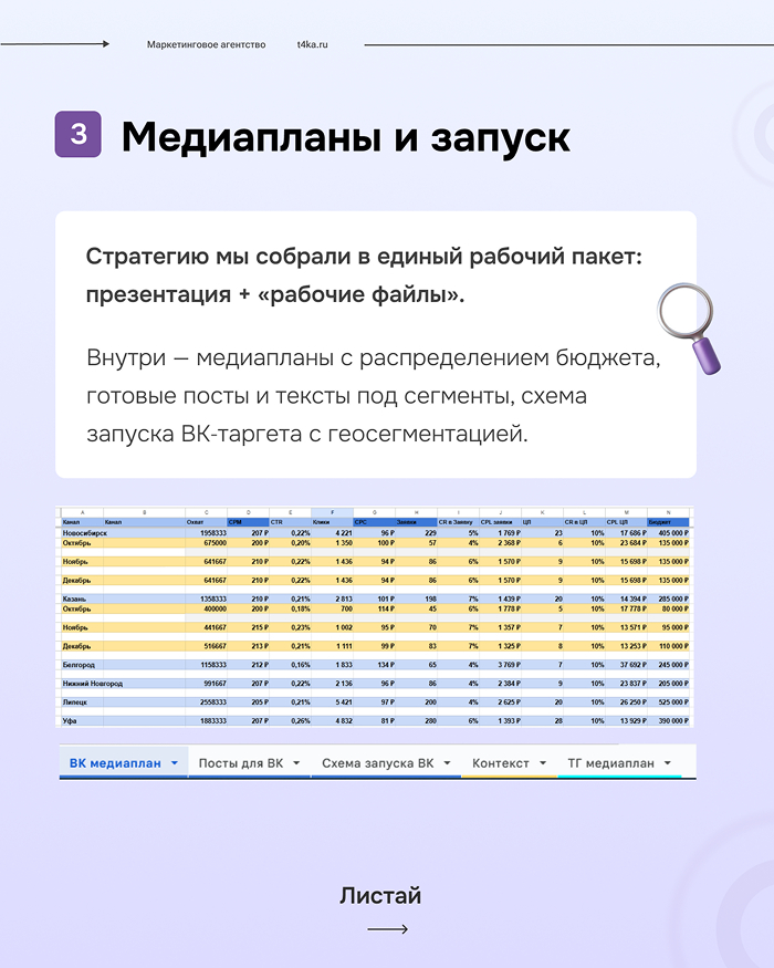 Стратегию мы собрали в единый рабочий пакет: презентация + «рабочие файлы». Внутри — медиапланы по ВК и Telegram с распределением бюджета, готовые посты и тексты под сегменты, схема запуска ВК‑таргета с геосегментацией и примерами креативов, медиаплан по Яндекс Директу, отдельный медиаплан по таргету и варианты лид‑форм.