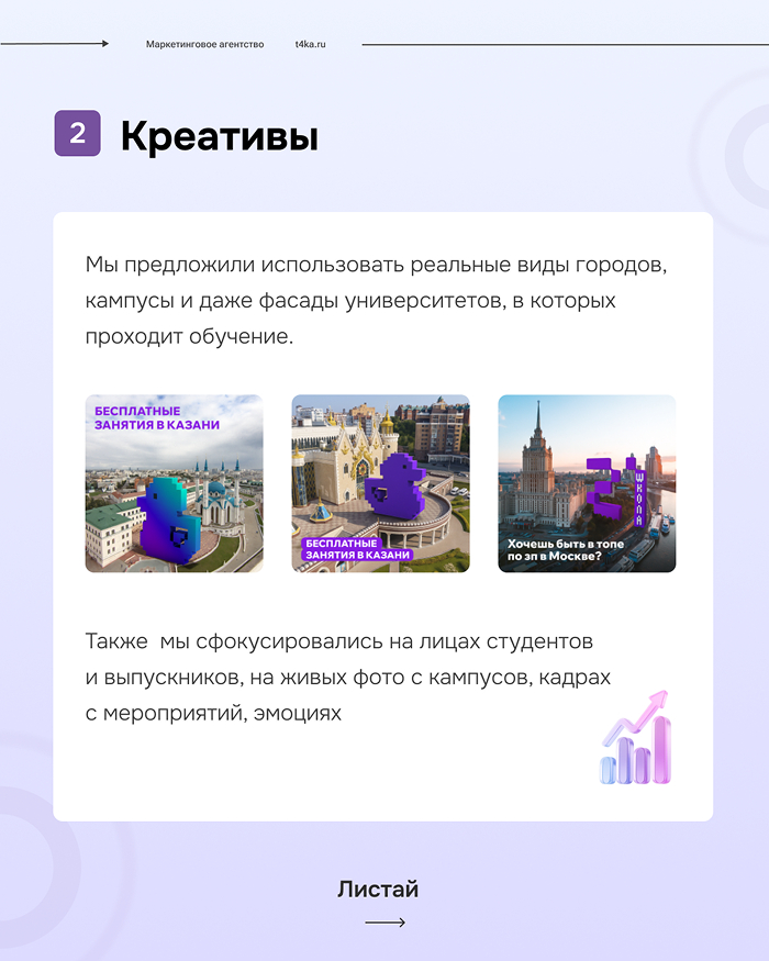 Мы предложили использовать реальные виды городов, кампусы и даже фасады университетов, в которых проходит обучение. На знакомые здания аккуратно «вшивали» фирменные элементы: пиксельную уточку, логотип школы, легкую пикселизацию памятников и площадей. По нашему опыту, такие геопривязанные креативы стабильно поднимают CTR на 25–30%, и здесь мы опирались как на проекты для других клиентов, так и на наш SMM‑опыт.