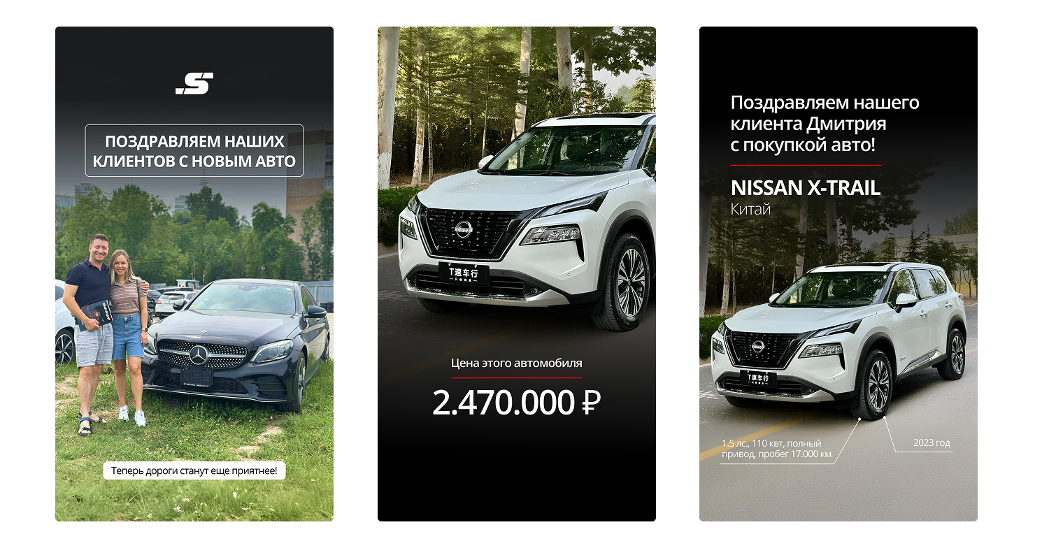 В основе концепции — максимальное доверие к бренду. Поэтому в ключевых макетах мы используем реальные фото клиентов с их автомобилями: это сильное социальное доказательство, которое показывает, что компания действительно доводит сделки до результата. Дополняем эмоцию конкретикой — ценой и характеристиками авто. Такой баланс «живых» историй и понятных цифр снижает скепсис, делает бренд ближе и помогает потенциальным клиентам легче представить себя на месте героев постов.