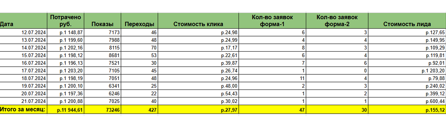 Работа велась с июля по декабрь 2024 года — от разгарa лета до начала зимы. За это время спрос сильно менялся: сначала люди активно занимались дачей, а ближе к холодам интерес заметно падал. Наша задача заключалась в том, чтобы сохранять высокую конверсию и приемлемую стоимость лида как в период большого интереса, так и тогда, когда внимание к дачным работам существенно снижалось.
