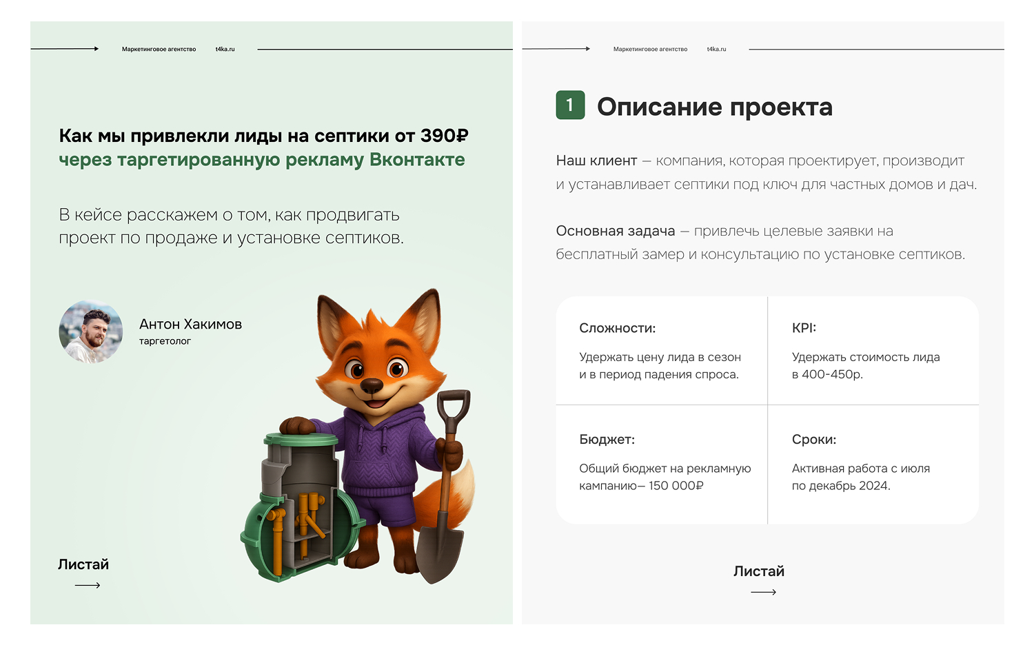 «Привет! Меня зовут Антон, я таргетолог. Специализируюсь на привлечении клиентов в сложном b2c-сегменте с длительным циклом принятия решения. В этом кейсе расскажу, как мы продвигали услуги по установке септиков в Ярославле. Несмотря на длительный период и «несезон», нам удалось получить 380 целевых заявок и вывести среднюю стоимость лида на уровень 396 рублей»