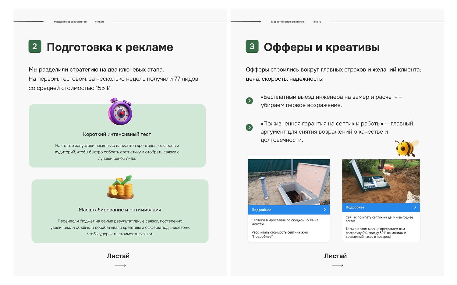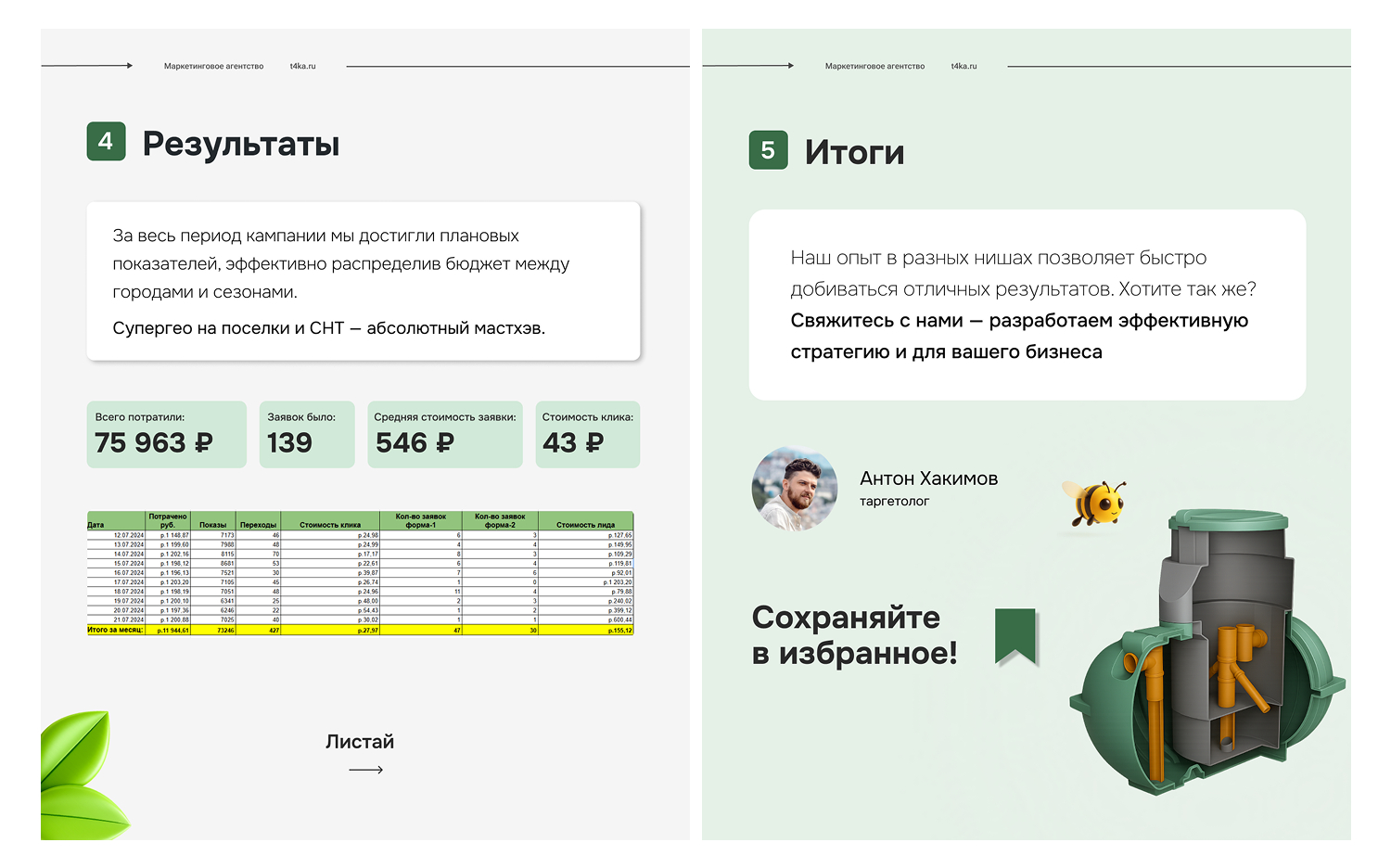 «Этот кейс наглядно показывает, как грамотно настроенная таргетированная реклама может принести стабильный поток целевых лидов на установку септиков при разумных вложениях в бюджет. Опыт работы с такой нишей и понимание специфики спроса позволяют нам привлекать обращение от реальных заказчиков, готовых к установке. Свяжитесь с нами, чтобы обсудить ваши задачи и выстроить эффективную стратегию таргета под установку септиков»