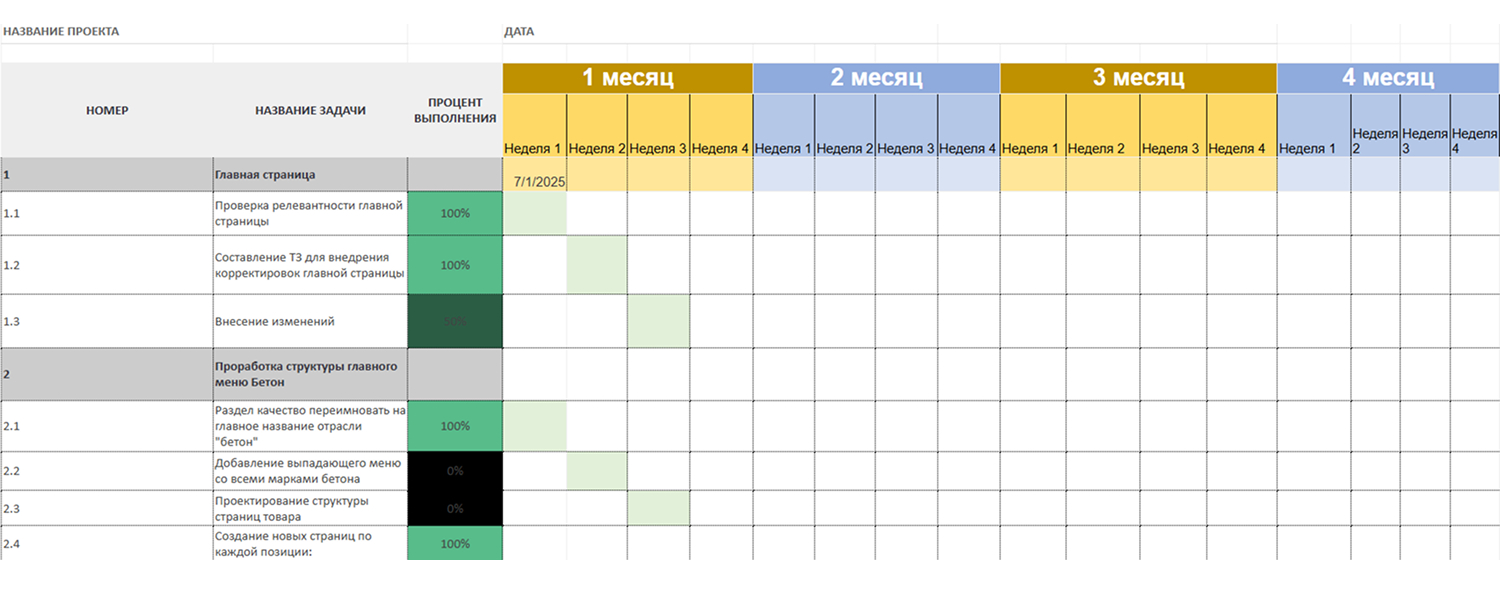 План работ по сайту и SEO на 4 месяца - дорожная карта с задачами по главной странице, структуре меню и созданию посадочных под марки бетона