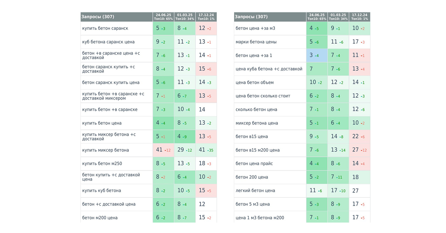 Запрос "бетон цена" поднялся с 14 места в декабре до 7 места к марту и до 5 места к июню. "Купить бетон" - с 14 до 7 места.