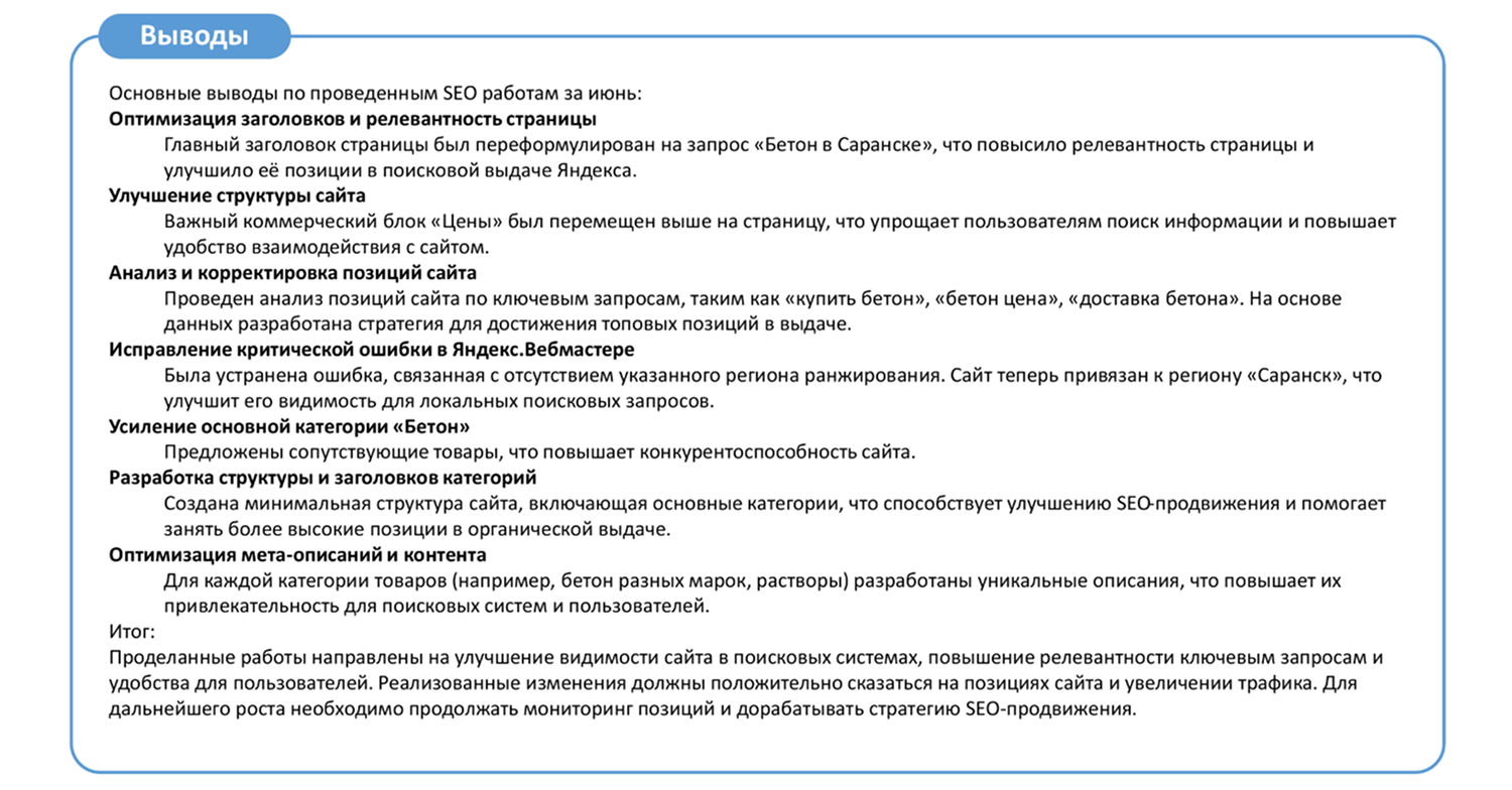 - в отчете по итогам работ отмечено, что изменения направлены на повышение удобства и релевантности сайта, а это в долгую приводит к росту конверсий и повторных обращений.