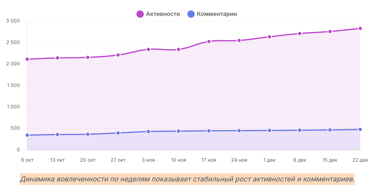 По данным отчетов, на старте фиксировали 779 активностей и 81 комментарий (неделя 29 апреля). Дальше динамику нужно было удержать и усилить, не проваливаясь по вовлеченности.