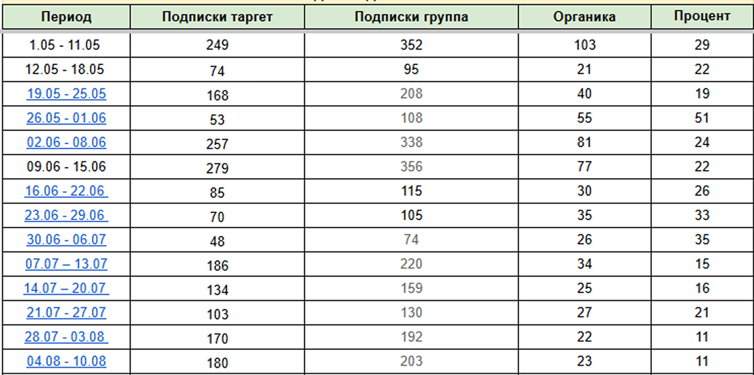 По отчету «Дар подписчики» видим, что подписки шли из нескольких источников: таргет, подписки в группе и органика. Примеры недель с заметным вкладом: