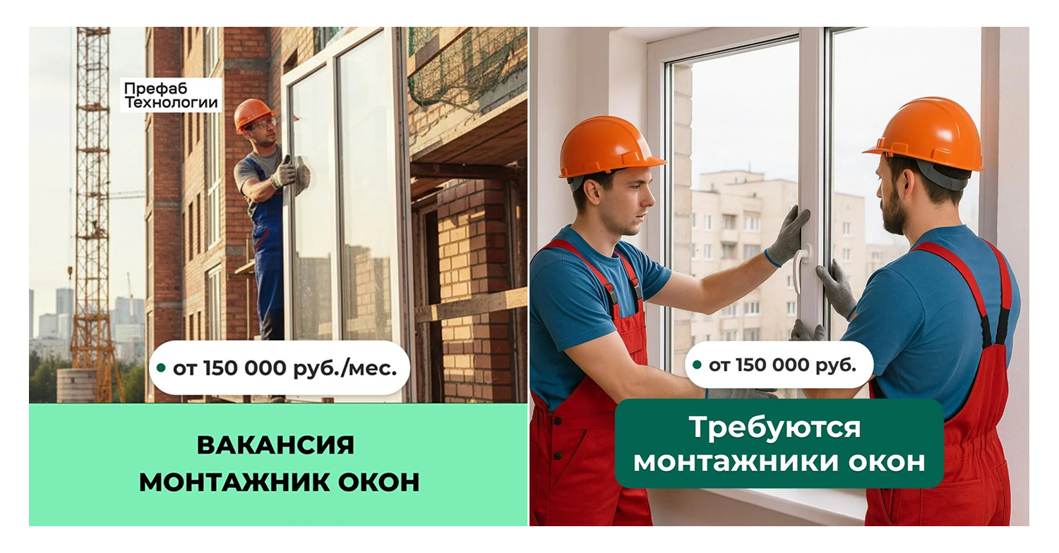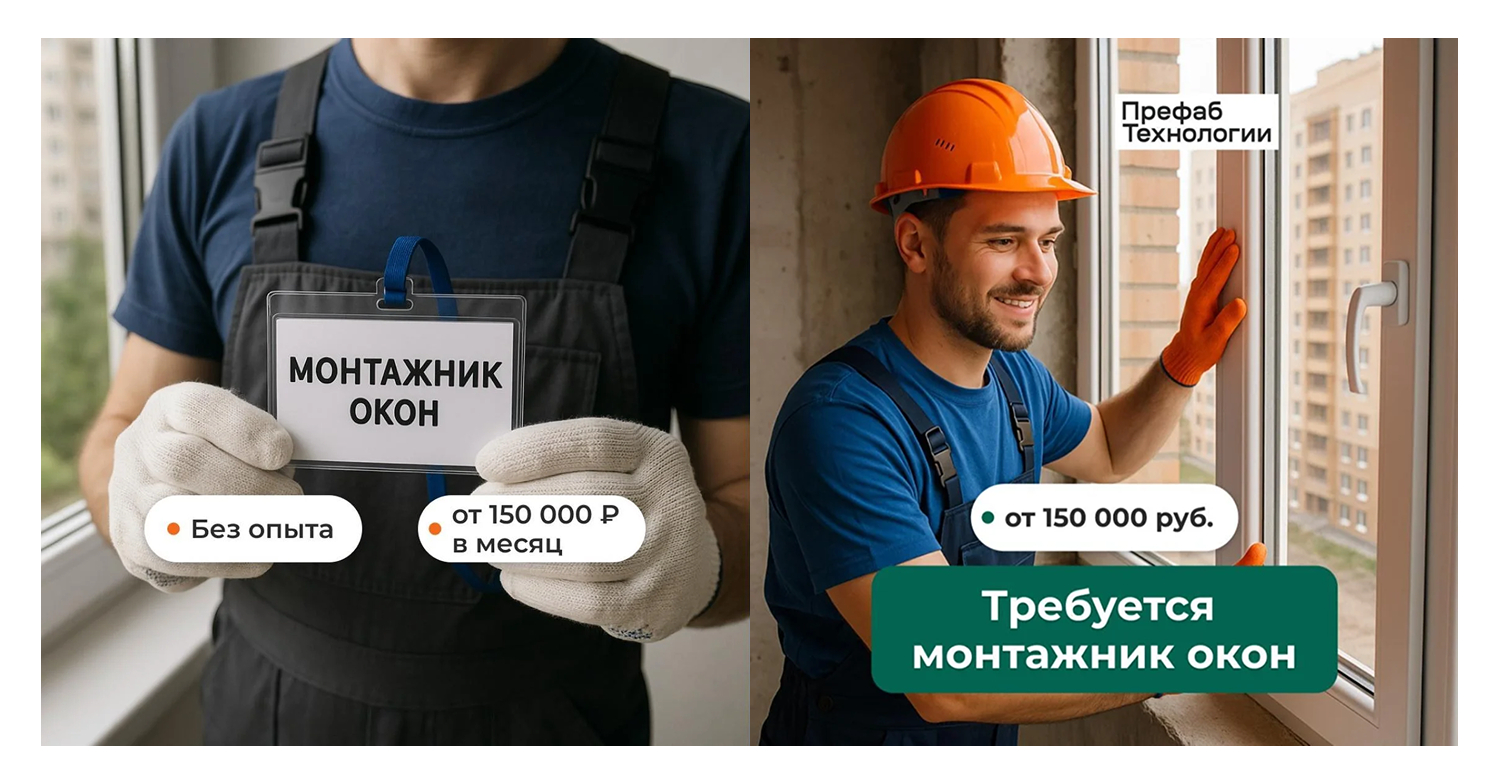 Для привлечения монтажников мы сделали упор на визуальное оформление объявлений. В качестве креативов использовали фотографии монтажников окон на работе. Они помогали сразу показать, о какой профессии идёт речь, и делали рекламу наглядной и понятной для кандидатов.