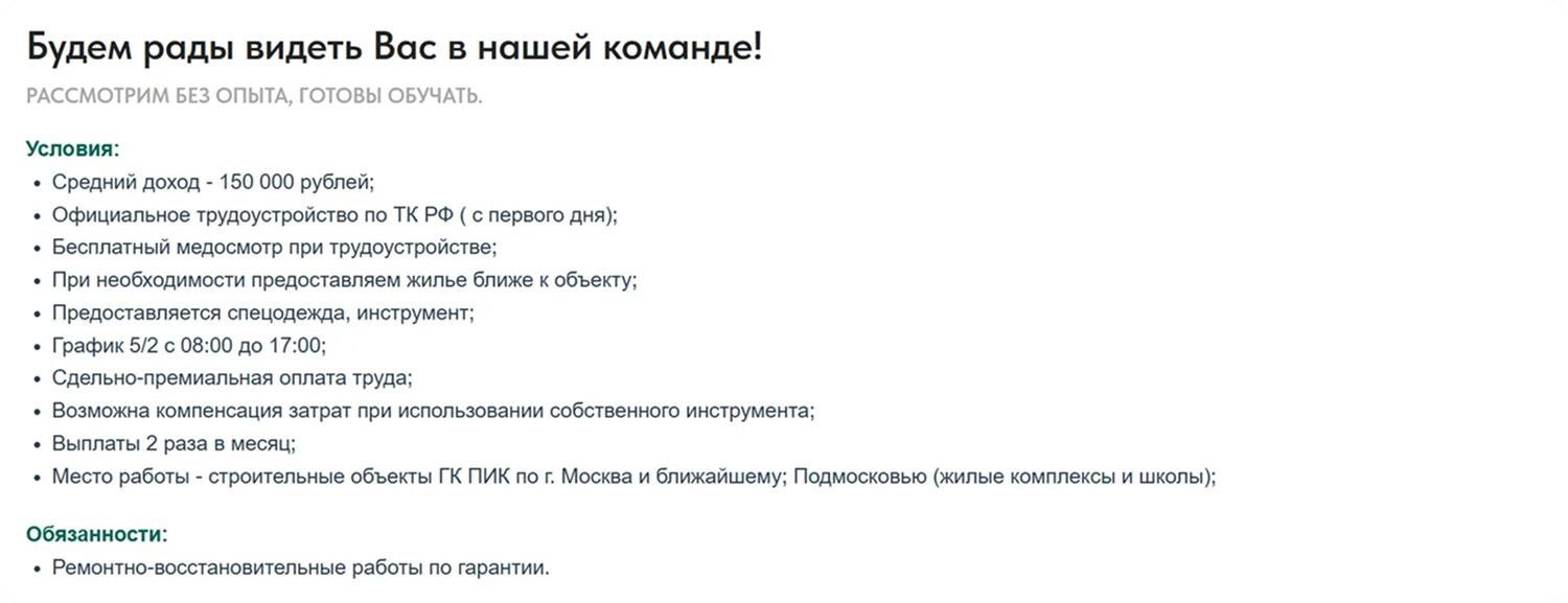 В текстах объявлений мы делали упор на чёткость и конкретику. Кандидат сразу видел, какая профессия требуется, нужно ли иметь опыт, и какой уровень заработка. Такой подход помогал человеку быстро понять, подходит ли ему эта работа, и принять решение об отклике.