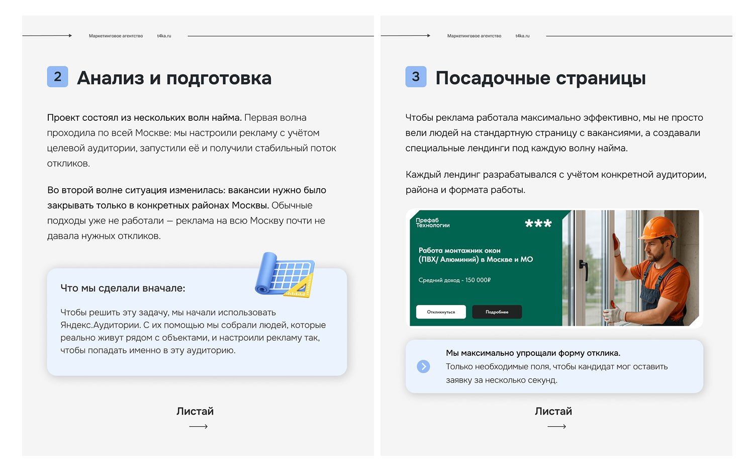 На первый взгляд задача выглядела стандартной — найти монтажников окон в Москве с помощью контекстной рекламы. Но важно было не просто собрать отклики, а привлечь кандидатов, которые действительно живут рядом с объектами, готовы оперативно приступить к работе и не пропадают после первого звонка