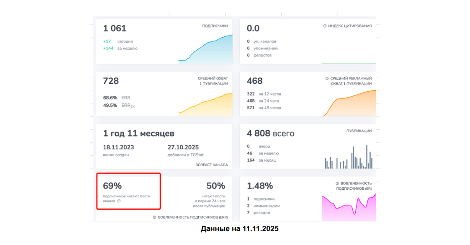 69% подписчиков читают посты канала — это отличный показатель вовлеченности, который подтверждает, что мы привлекли именно целевую аудиторию.