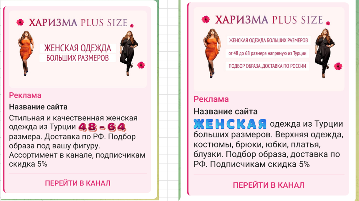 «Харизма Plus Size» — это Telegram-канал с женской одеждой больших размеров, с доставкой по России. Проект работает в B2C формате и продвигается через Telegram Ads с размещением в тематических каналах.