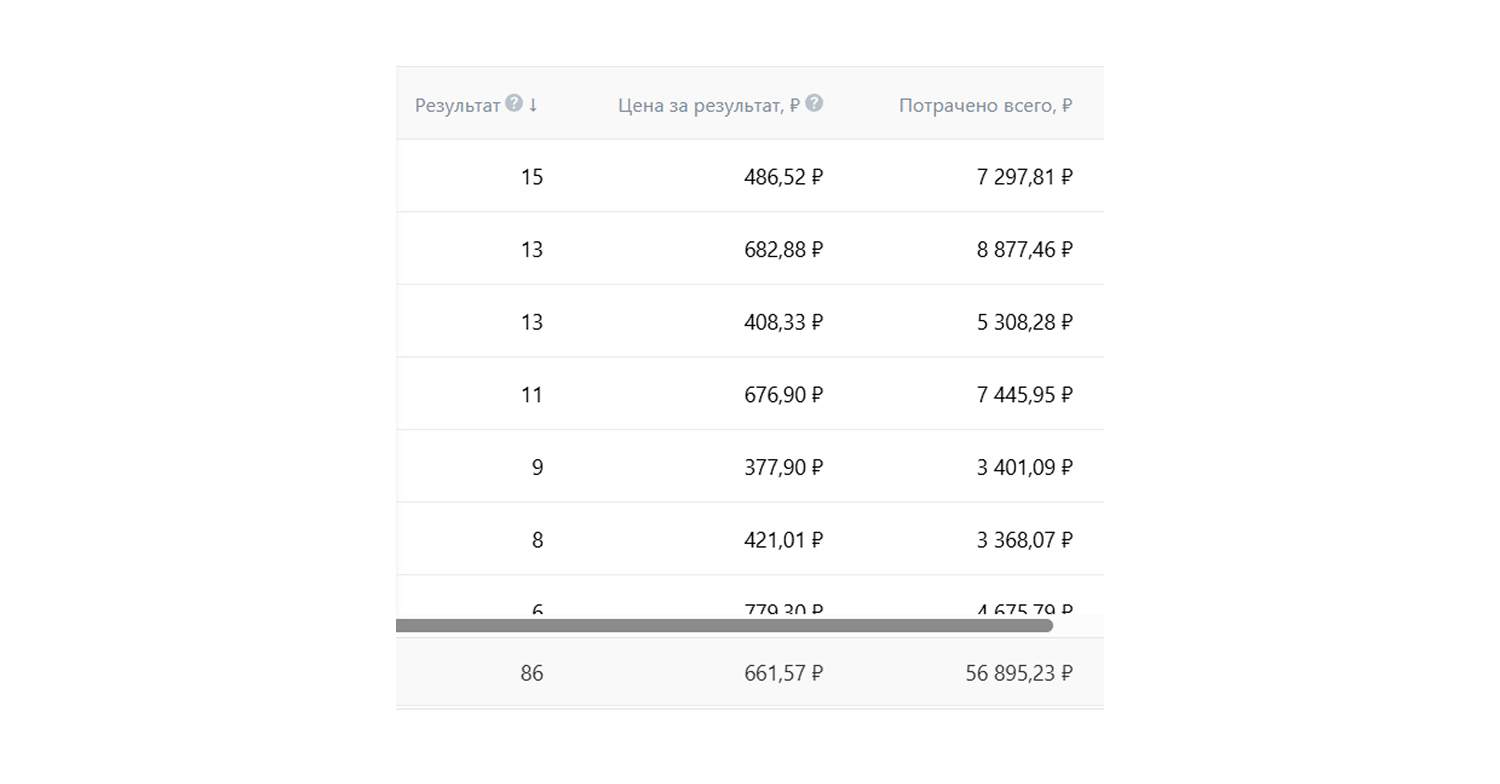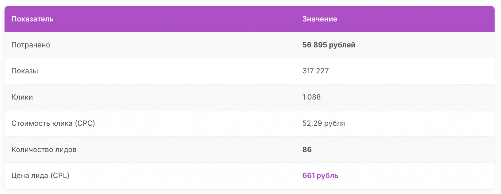 Узкая ниша, регион, ограниченный бюджет — цена клика выше средней, но качество трафика и итоговая цена лида (661 рубль) полностью оправдали затраты.