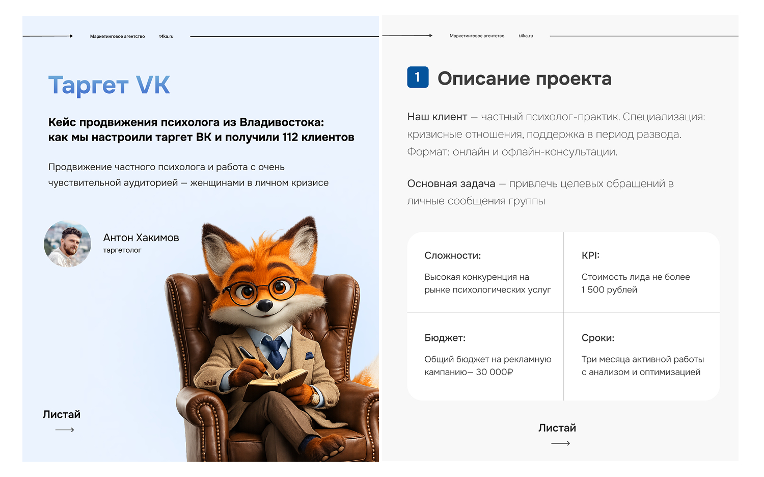 «Привет! Меня зовут Антон, я таргетолог. В своей практике я помогаю не только товарному, но и экспертно-личному бизнесу. В этом кейсе расскажу, как мы продвигали частного психолога во Владивостоке, работая с очень чувствительной аудиторией - женщинами в личном кризисе»