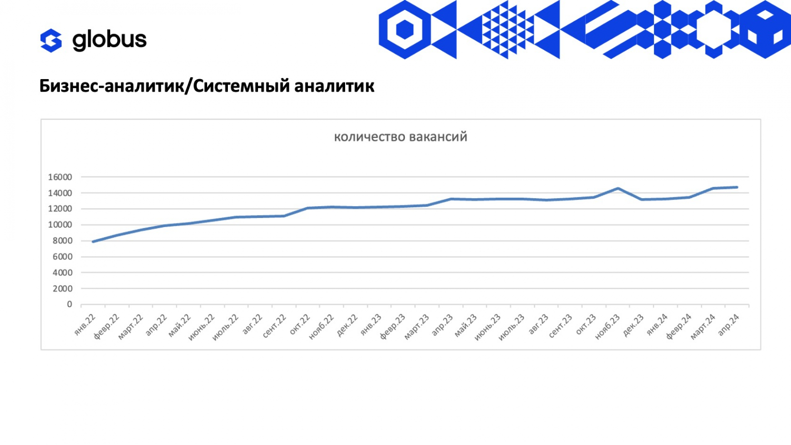 Как мы уже упомянули ранее, самая востребованная на рынке вакансия на данный момент – аналитик. Существует определенный кадровый голод на системных и бизнес-аналитиков, причем все чаще компании хотят собственных аналитиков в штат. Как итог, количество вакансий превышает уже 15 тысяч.
