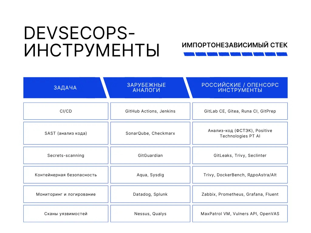 Особую актуальность DevSecOps приобретает в проектах, реализуемых внутри защищенных контуров: в банковском секторе, госсекторе, телекомах, промышленности. При этом все чаще приходится полагаться на импортонезависимые инструменты и отечественные технологии.