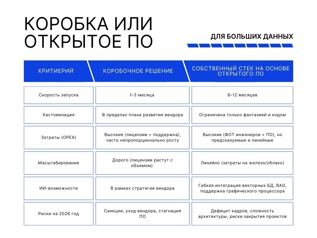 Коробочные решения дают скорость и простоту на старте. Открытое ПО обеспечивает контроль, гибкость и долгосрочную устойчивость. Именно поэтому в 2026 году все больше компаний, особенно в условиях новой экономики данных и тотальной цифровизации, делают осознанный выбор в пользу собственных платформ больших данных на базе открытого ПО. Не потому, что это дешевле, а потому, что это позволяет превратить данные в настоящий актив, а не в ограничение, и гибко реагировать на вызовы рынка, где ИИ и данные стали главным источником конкурентного преимущества.