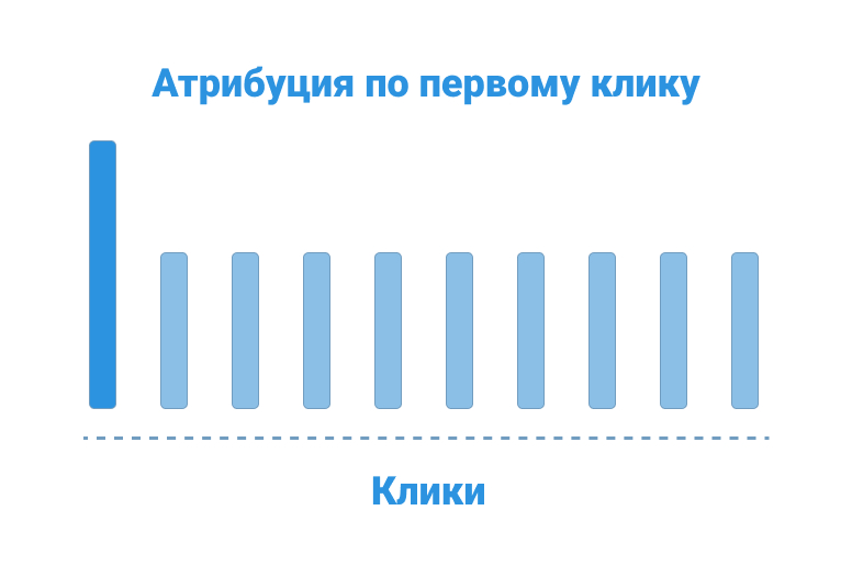 Большую ценность за конверсию получает первое взаимодействие с пользователем, например, клик на рекламу. Считается, что целевое действие принесла платформа, где было первое касание, остальные каналы не учитываются.