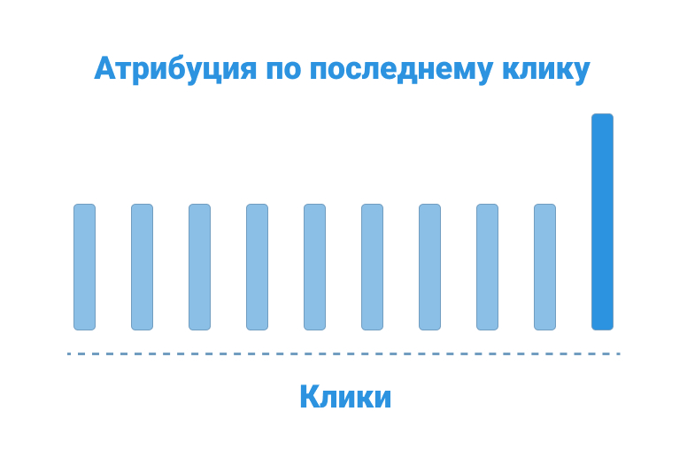 Основная ценность у источника, на который пользователь перешёл перед тем, как совершить конверсию. Атрибуция по последнему клику долгое время была самой популярной и сейчас стоит по умолчанию в Google Analytics.