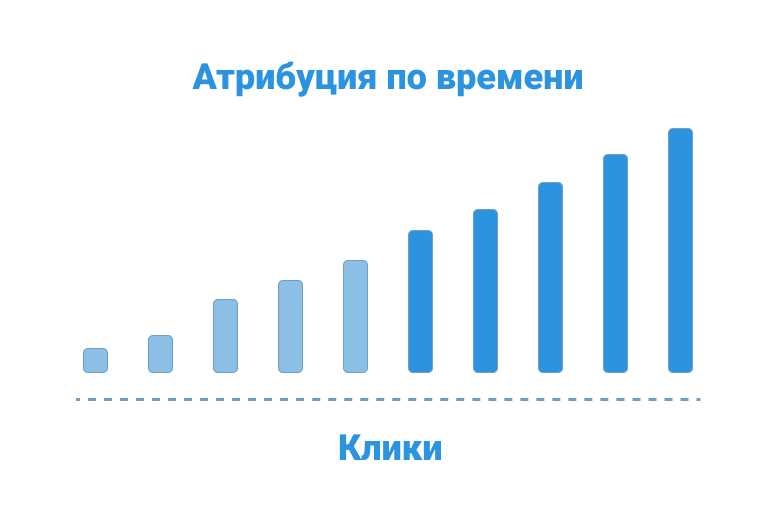 Больший вес в этой модели у взаимодействий, которые были ближе по времени к конверсии. Первые касания оцениваются меньше.