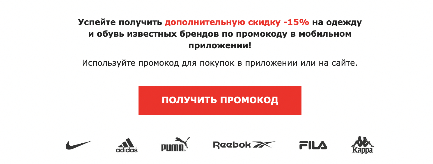 Сообщают о скидках и сроках их действия. CTA таких писем всегда продающий. В примере рассылки от спортивного магазина дополнительно предлагают бонусы за покупку, чтобы клиент вернулся снова.