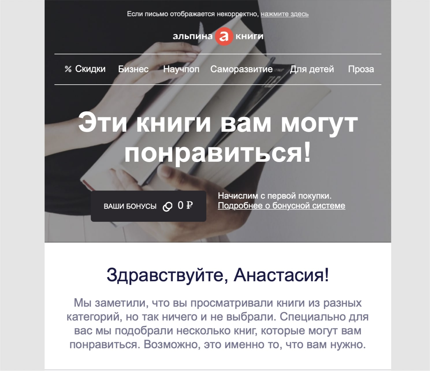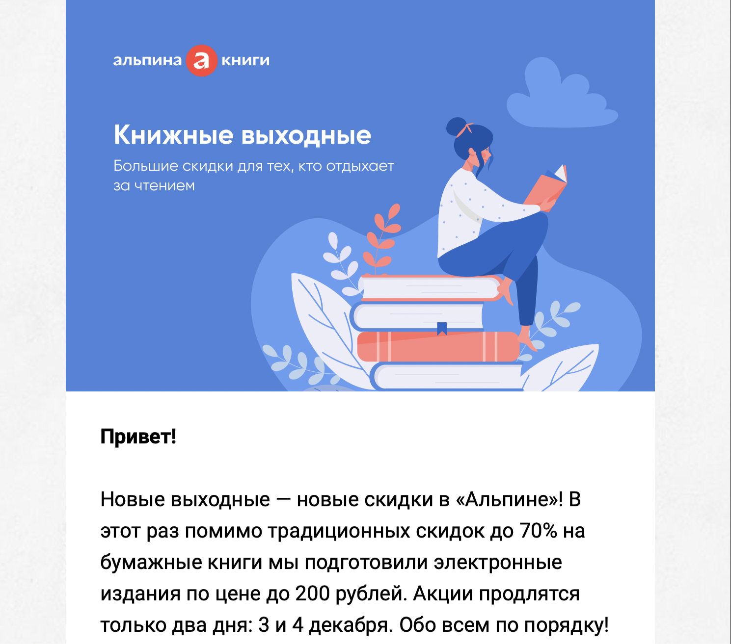 Эти письма тоже про скидки, но обычно сообщения информируют клиентов о снижении цен на группу товаров. Например, маркетинговая рассылка от книжного магазина рассказывает о снижении цены на 1300 книг, а минимальная стоимость начинается от 200 рублей. Это мотивирует клиента зайти на сайт и посмотреть варианты по скидке.