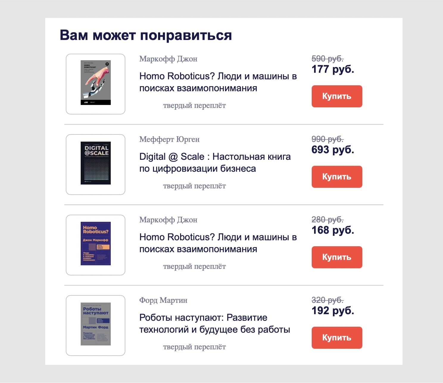Предлагают клиенту товары, которые похожи на те, которые он покупал или просматривал. Такие письма часто присылают книжные интернет-магазины.