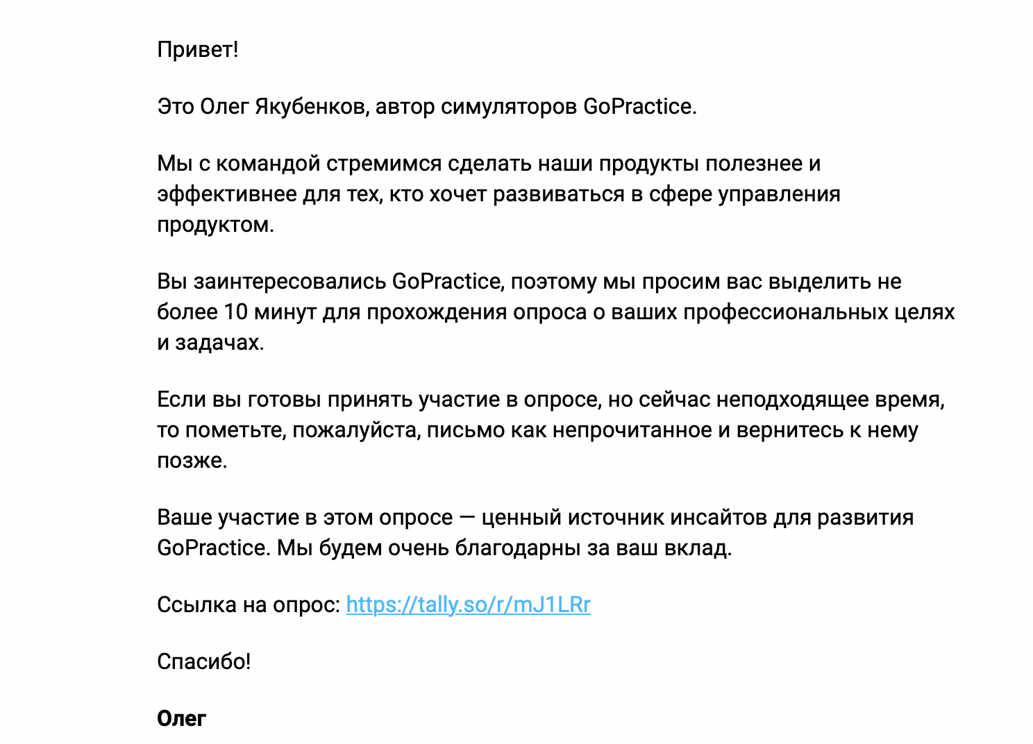Иногда напомнить о себе получается через запрос обратной связи. Такие письма не обязывают к покупкам, зато предлагают выразить своё мнение.