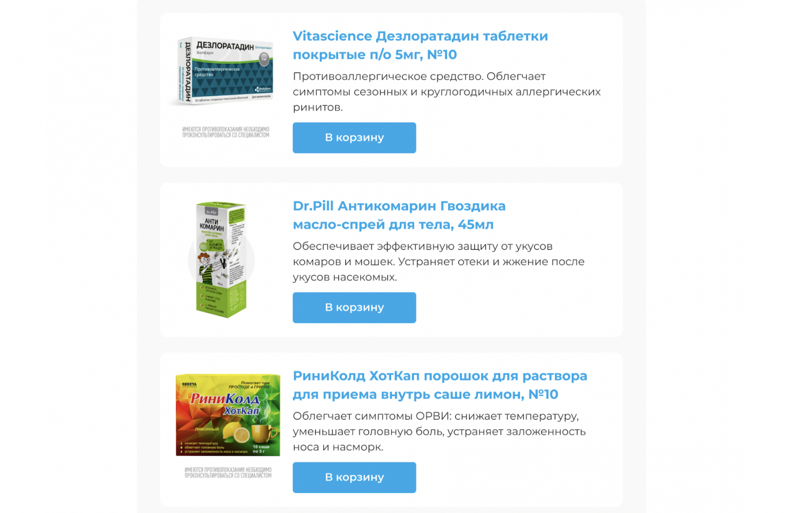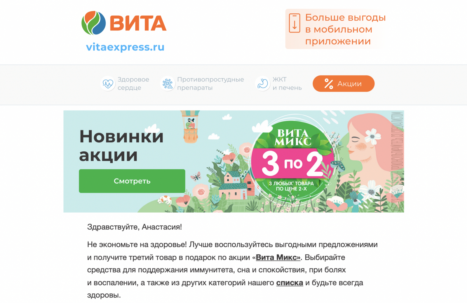 Расширение ассортимента в акции от аптечной сети. В письме предлагают получить третий товар бесплатно, причём это новые товары, на которые скидок раньше не было.