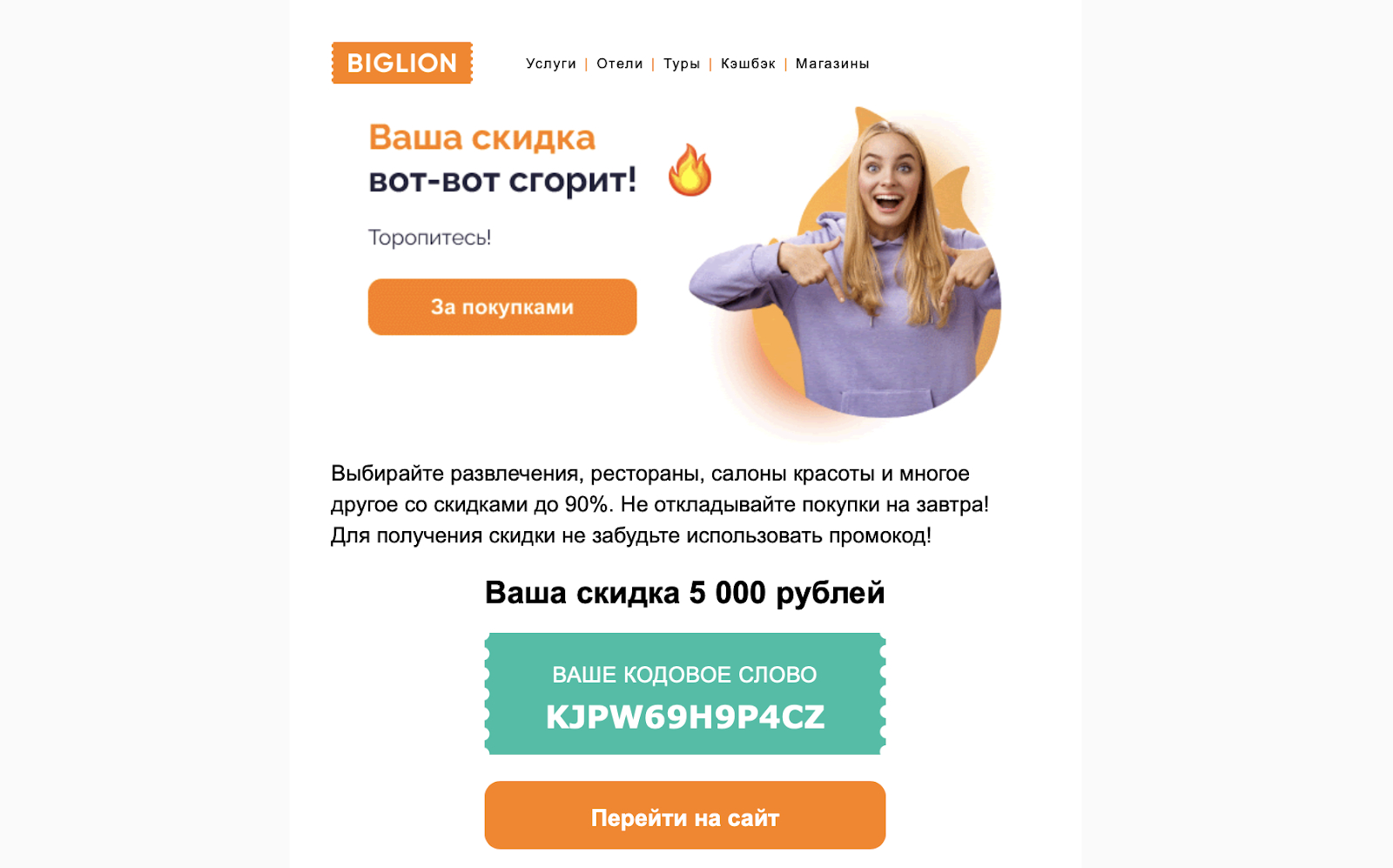 Фиксированная скидка от сайта-купонатора Biglion — промокод на 5000 руб. Эту сумма сразу есть в теме письма, что мотивирует открыть эмеил.